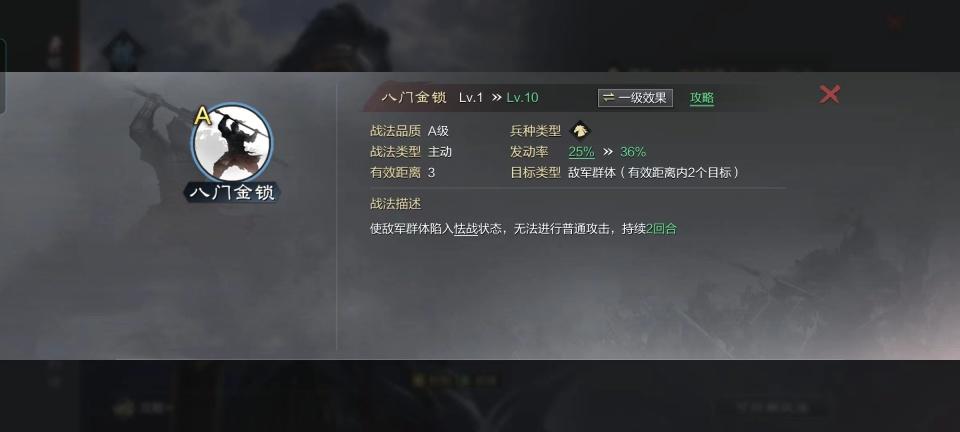 曹仁,具备一定的场控能力,系统推荐他适宜打前锋位置。默认专属战法八门金锁,满级发动率可以达到36%,能够造成敌方最多两个单位陷入两个回合的怯战。对于群马超那样严重依赖甚至完全依靠普攻杀伤敌人的菜刀选手来说,可谓是精准的压制。