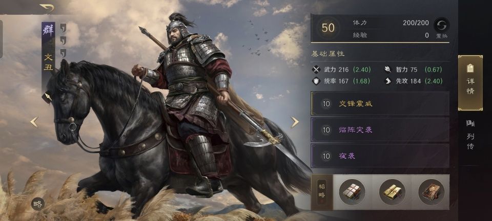 文丑的默认专属战法交锋震威能在普攻后获得必中状态,尽管发动率只有55%,却具备极其可靠的稳定性。在此基础上跟进的第二战法临阵突袭和第三战法夜袭,都能把文丑的优势发挥到位。兵道、时利的善本和专属金书武下构成了文丑的韬略库,文丑在与颜良成功发动追击战法之后,还能降低自己所受的伤害。就人设来看,文丑总体上还是偏肉盾的,降低对方的统率也是为了给好哥们颜良铺路。