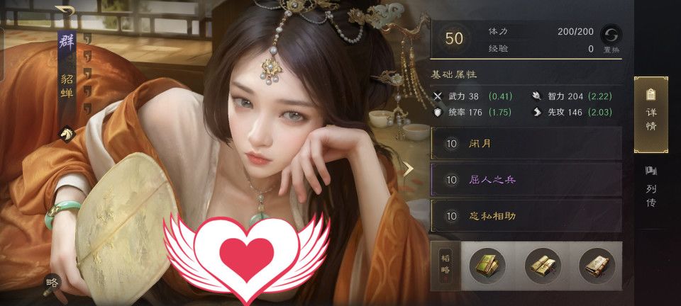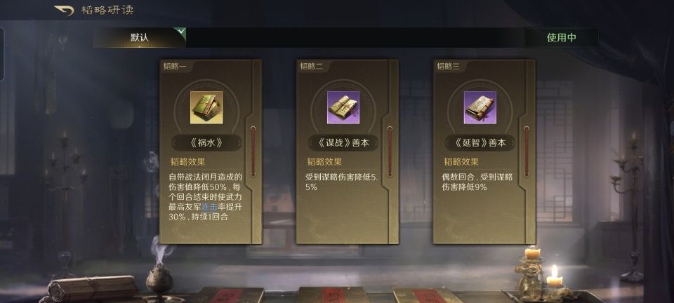 当前版本三国谋定天下的貂蝉,凭借着闭月战法,确实相当适合挡在前排做肉盾。至少放在这场战斗中,闭月使得对面的许褚和袁绍都很难打疼她,加上屈人之兵和忘私相助,虎痴的牙都被她掰弯了。貂蝉韬略库里的三本书,依次研读了金书祸水、谋战和延智的善本。本队伍武力值最高的角色是文丑,故而文丑将获得闭月的连击加持。