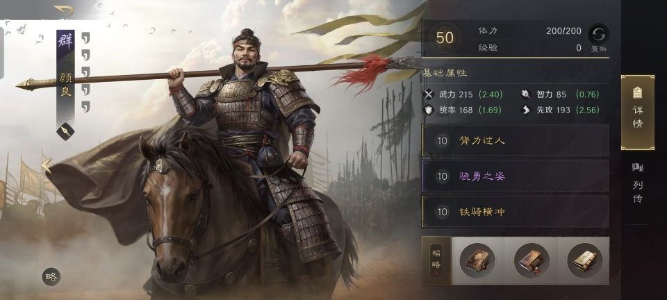 压轴登场的颜良,承载了全队的核心输出重任!他在三国谋定天下的默认战法膂力过人,是个100%发动率的追击战法,对于武力值比他低的角色而言,这追伤可算是又稳又狠。颜良的第二和第三战法,分别学习了骁勇之姿和铁骑横冲,把连击和会心也都安排得明明白白。小金书武上、武锋和玄机的善本,让我们可以明确感知到,他们这个组合就是要铆足劲在前四回合解决对手!
