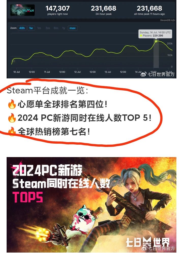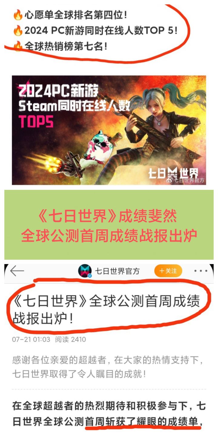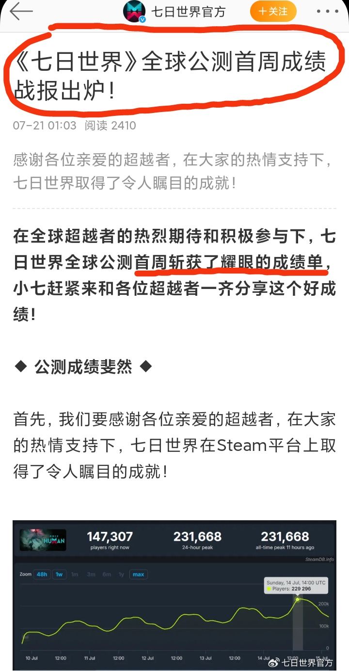 7/21号凌晨,《七日世界》官博发文公布了其全球公测首周成绩战报❗❗❗