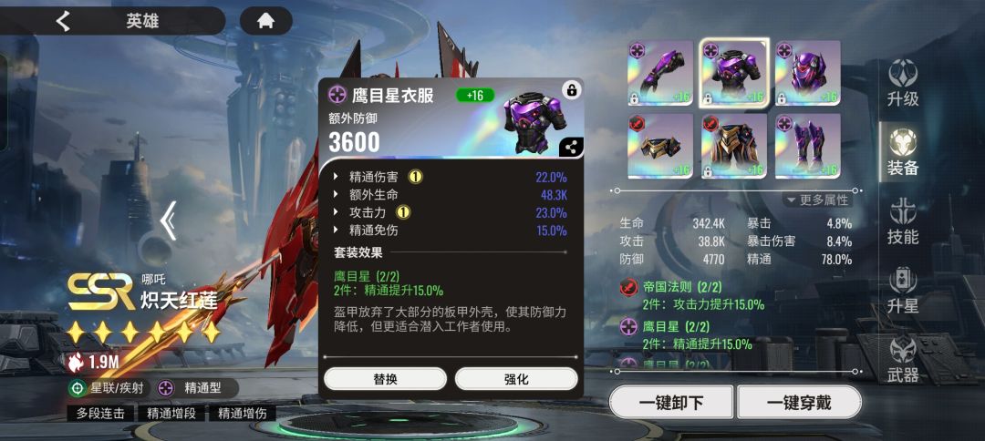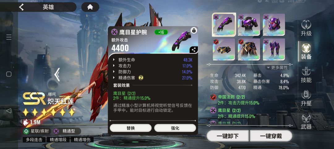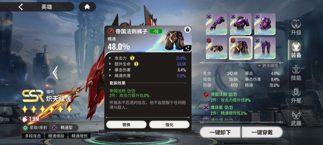 基于以上公式,我们看到三个关键属性,攻击、精通和精通伤害。类同于暴击型英雄,需要的属性也很多,好在帝国套胚子多,总有一家用的上。
