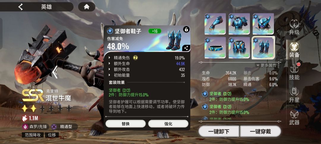 综合考虑到牛魔目前的就业环境主要还是大招的减攻击和伤害加成、专武的打断,因此个人建议老牛放弃打精通伤害,全力堆防御和适当的生命。