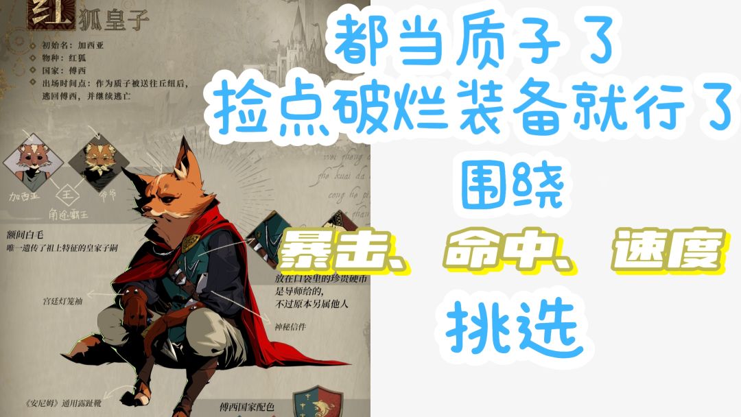 狐狸:稳定,前期群攻技能锁死,敌方四个全残血也不要用。装备捡破烂就行,以暴击、命中、速度为主,转角色方便。主玩狐狸就用疾雷(斗士)+最初之血(画板🎨)+随机
