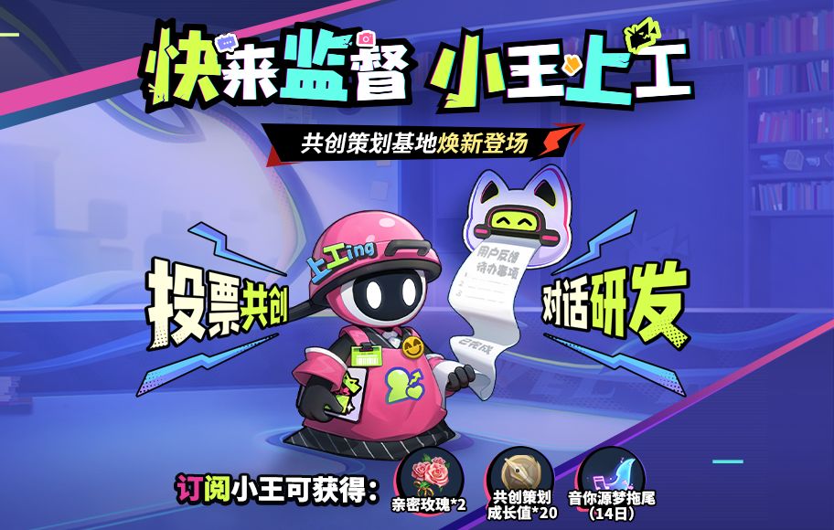 点击【订阅上新】即可实时收到最新共创资讯提醒,首次订阅必得【亲密玫瑰*2+共创策划成长值*20+音你源梦拖尾特效(14日)】。