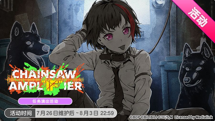 7月26日维护后,游戏内将开启TV动画「链锯人」联动特别篇——「CHAINSAW AMPL"IF"IER」任务演出活动!参与活动收集「恶魔的肉片」,即可在「G.D.S本部」兑换丰厚奖励哦!