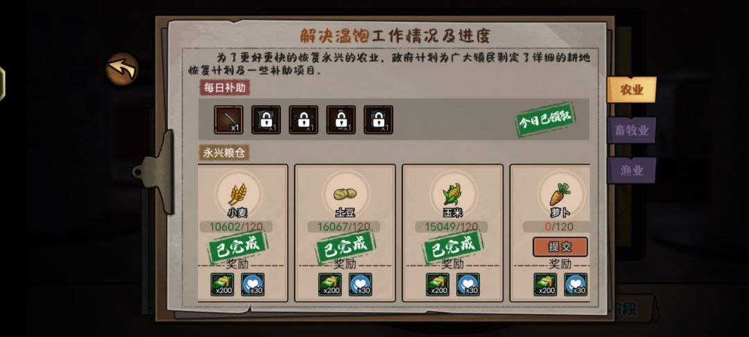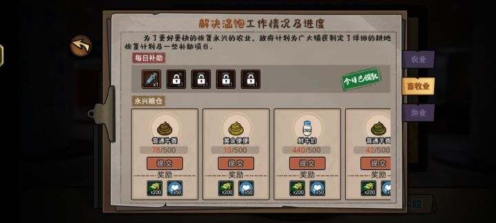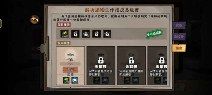 今天也是发现更新了后续重建版本,首先还跟第一阶段一样需要清理农田牧场淤泥,提供材料修复,之后可进入第二阶段,解决温饱,分农业,畜牧业,渔业,按照要求提供需要的农作物,鱼,粪便即可完成就不做过多赘述了,提一下新玩法出海捕鱼,玩法如图,跟黄金矿工操作一样,船的抓钩会左右摆动,需要抓到海里的鱼拉回,跟黄金矿工区别在于鱼也会移动,所以需要根据抓钩速度对鱼进行一点预判才能抓到,两种道具冰冻弹可以冻住所有鱼,超声波可以看到整片海域所有的鱼的位置,不过由于都是鱼的黑影,所以抓到之前无法确定抓到的鱼是什么种类,更新的新鱼种类我也放了图,缺的那一种是皇带鱼,比较稀有我目前还没抓到,农业畜牧业渔业也是三种工作自然更新了新的勋章等级,,上限50级,另外更新支线找神秘人对话可以开启。得到一张藏宝图之后到大公园以物换物收集六种宝物碎片,每种20个可以合成。这个任务是地下文物那边神秘机关剧情的开端,目前还没后续,可能会在新版本出现,碎片用钱兑换是一个100万,也可以用种植的一些特定农作物兑换
