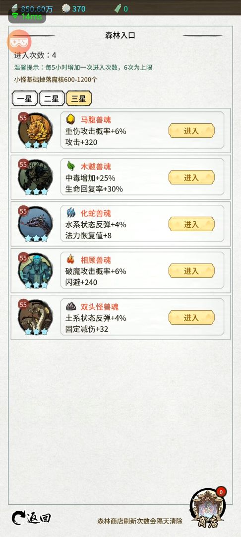 森林探险是获得战宠升级,进阶,洗练的副本,副本内固定有三个小怪和一个首领,还有许多随机事件,包括投资彩贝,商店,救人等,运气好能获得许多灵石,天籁碎片,灵珠碎片,目前等级能看到的是一星,二星,三星,这个需要注意在能合出一星兽魂的时候,有实力就可以打二星了,获得魔核翻倍,打死一个小怪也值了