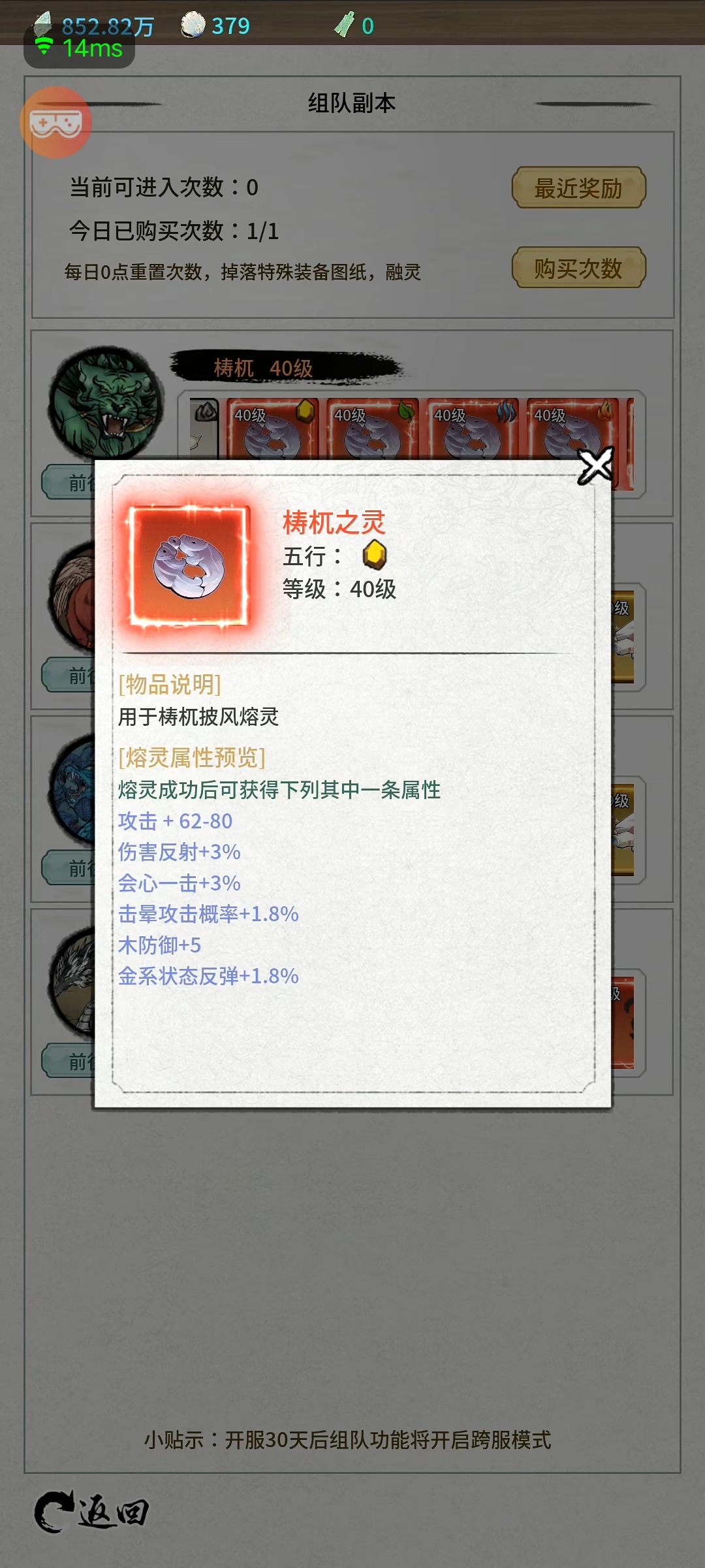 40级开启的组队副本可以获得专属装备-披风,每天四次免费次数,一次付费次数,副本没一共有三层,前两层都是三个小怪,第三层是两个小怪一个boss,组队可以招募,可以找人机打,基本同等级都能打过,每天打满就行,获得的材料用图纸加10个梼杌之灵可以直接打造,装备属性加上强化还是比较可观的。