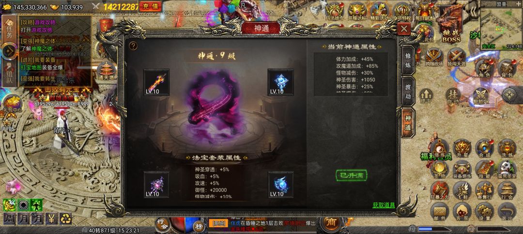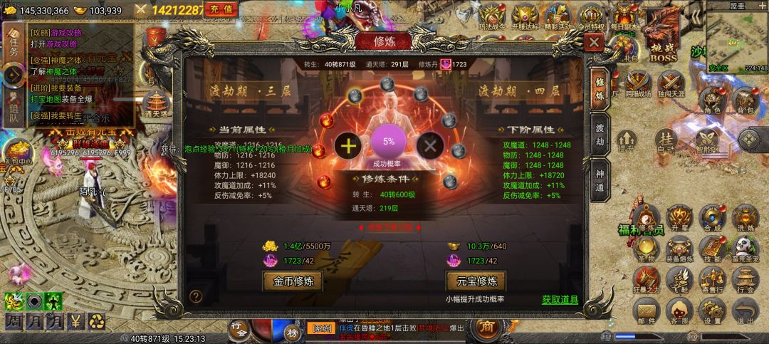 修炼:游戏最重要资源,红包!世界伤害第一,皇宫,挑战boss大乱斗,一定要拿最高奖励!皇宫如果可以一个人吃就一个人吃,因为这些合区就不一定吃的到了!点修炼唯一要注意化神期之前千万别用培元丹来点,因为后面会非常缺!攒住!