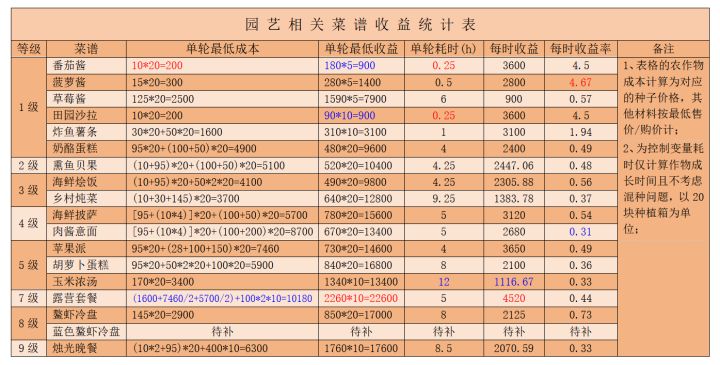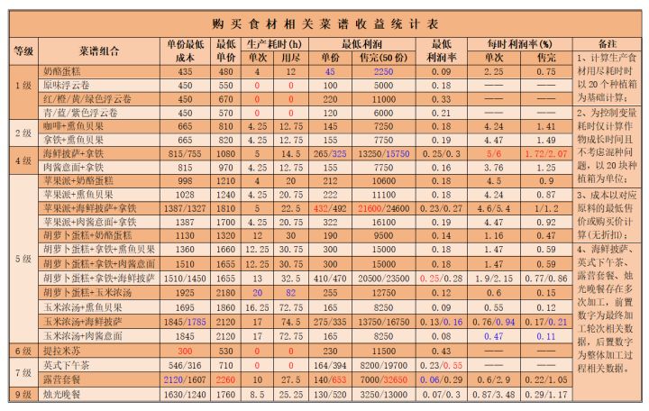 公测的食谱价格和捉虫测试的版本没什么变化,所以只是在之前的基础上完善了一下,等级比较高的食谱以及更细致的收益计算还没肝出来,会慢慢再继续补充,细节部分可能有所疏漏,欢迎指正