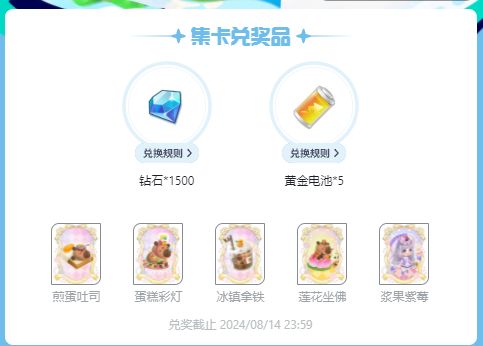 集齐“煎蛋吐司”“蛋糕彩灯”“冰镇拿铁”“浆果紫莓”即可兑换奖励【钻石*1500】,共15份