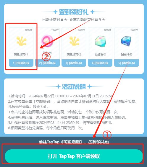 参与TapTap签到活动累计签到5天,【钻石、萌鱼烟花、星虹石】等福利道具通通送给馆长你~