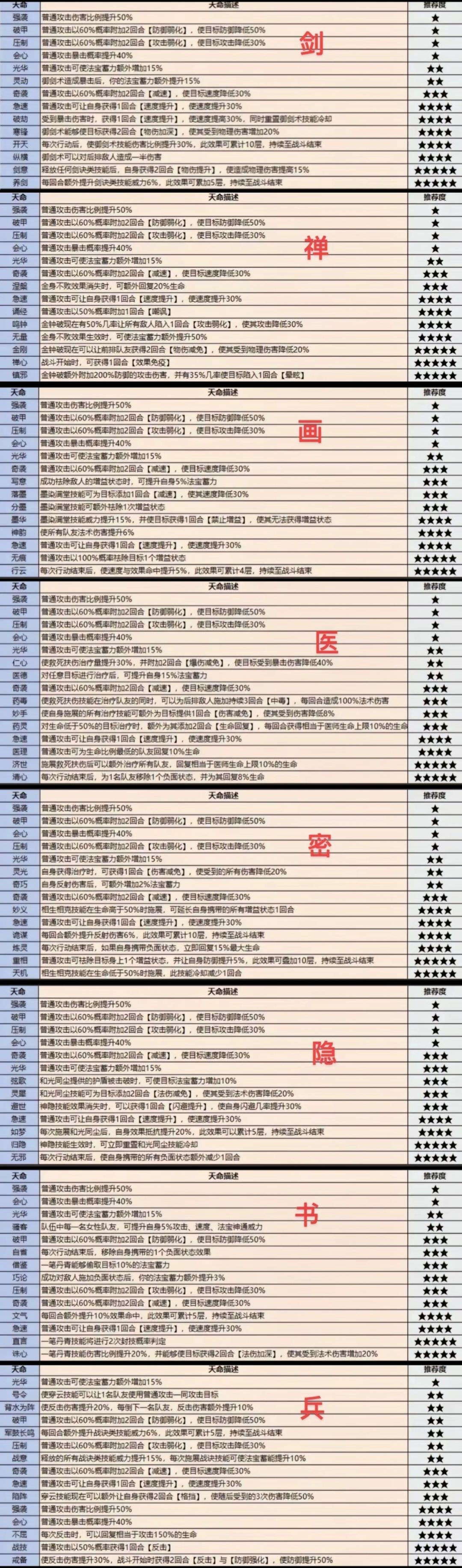 没做完的表格放出来给大家自行查看,包含职业:剑禅舞书画兵医蛊隐密