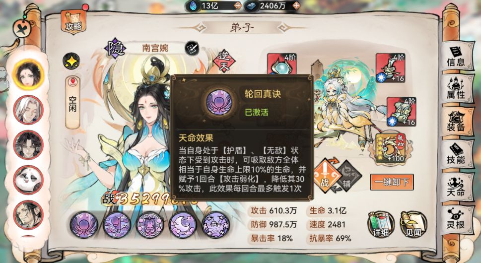我们来看他的天命【素女轮回功】 我们来看他的天命【素女轮回功】:当自身处于【护盾】、【无敌】状态下受到攻击时,可吸取敌方全体相当于自身生命上限10%的生命,并赋予1回合【攻击弱化】,降低其30%攻击,,此效果每回合最多触发1次