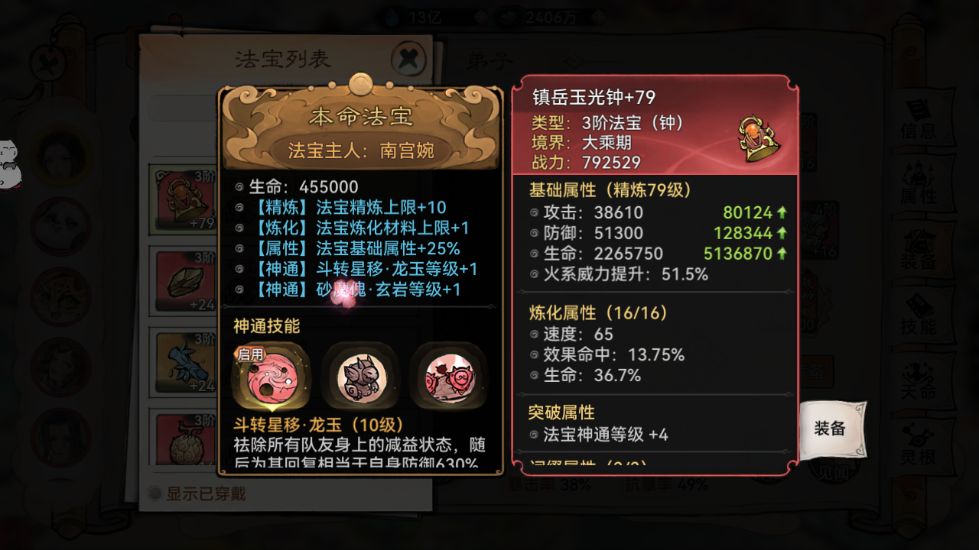 下面是我测试的南宫婉前排的视频,本命法宝佩戴的是+79镇岳钟胚,炼化生命。