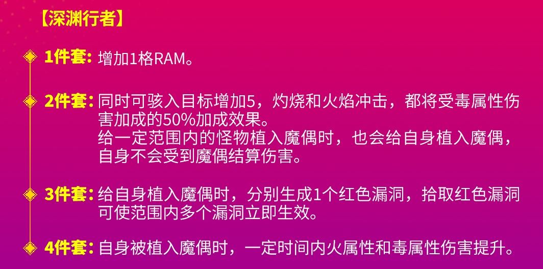 自身被植入魔偶时即可触发固定范围的毒版火焰冲击,该触发条件在深渊行者2件套的加持下是比较容易的,并且依靠火焰冲击同样能给敌人挂上灼烧,还是范围攻击,而且雅达的镀层仅影响火焰冲击伤害,不影响范围,因此只挂灼烧的话没有镀层也是可以的,且签到就送,也是一个非常不错的选择。