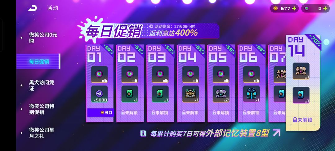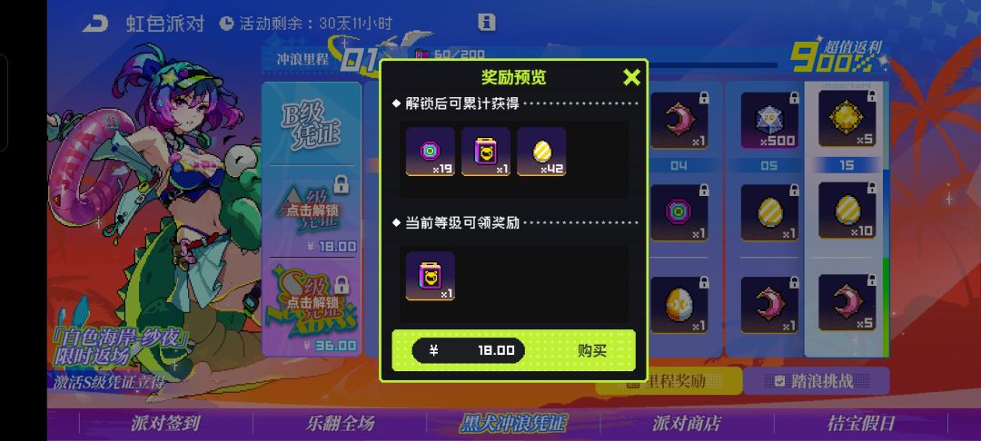 A档位(18元解锁)可获得:霓虹币*19,角色自选*1(并非全角色,重复角色可转换为太阳石/特工兑换券),小型孵化舱*42