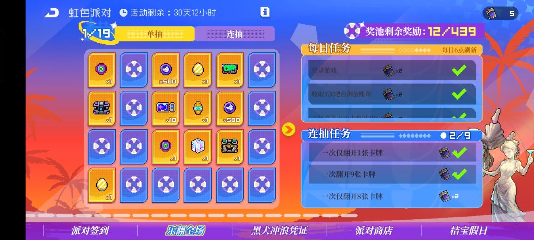 白嫖(不消费太阳石)最多可获取150派对礼券,其中100来源于乐翻全场,50来源于10天签到白嫖