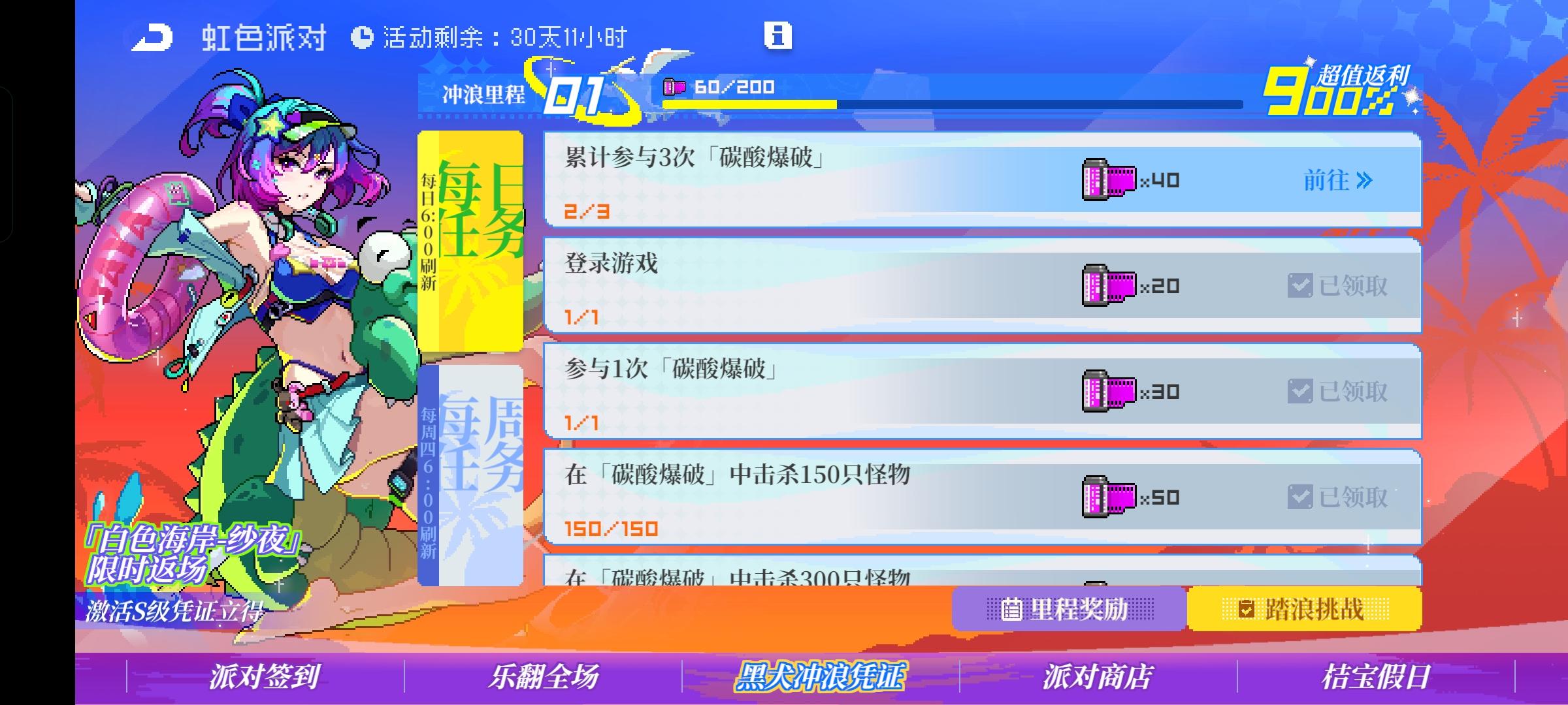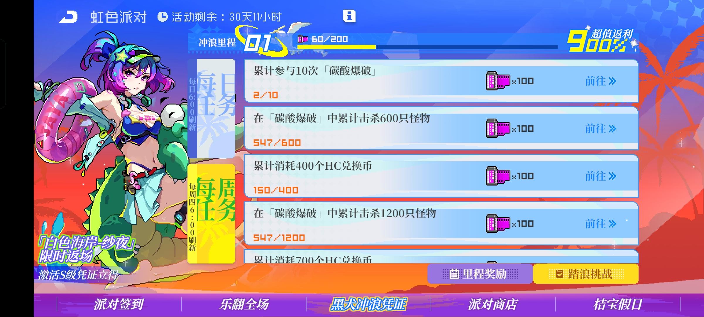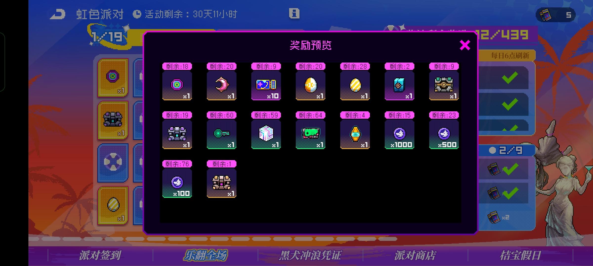 累计可获得,霓虹币*20,月亮币*20,孵化仓*20,小型孵化舱*30,8型自选模组*1,派对礼券*100