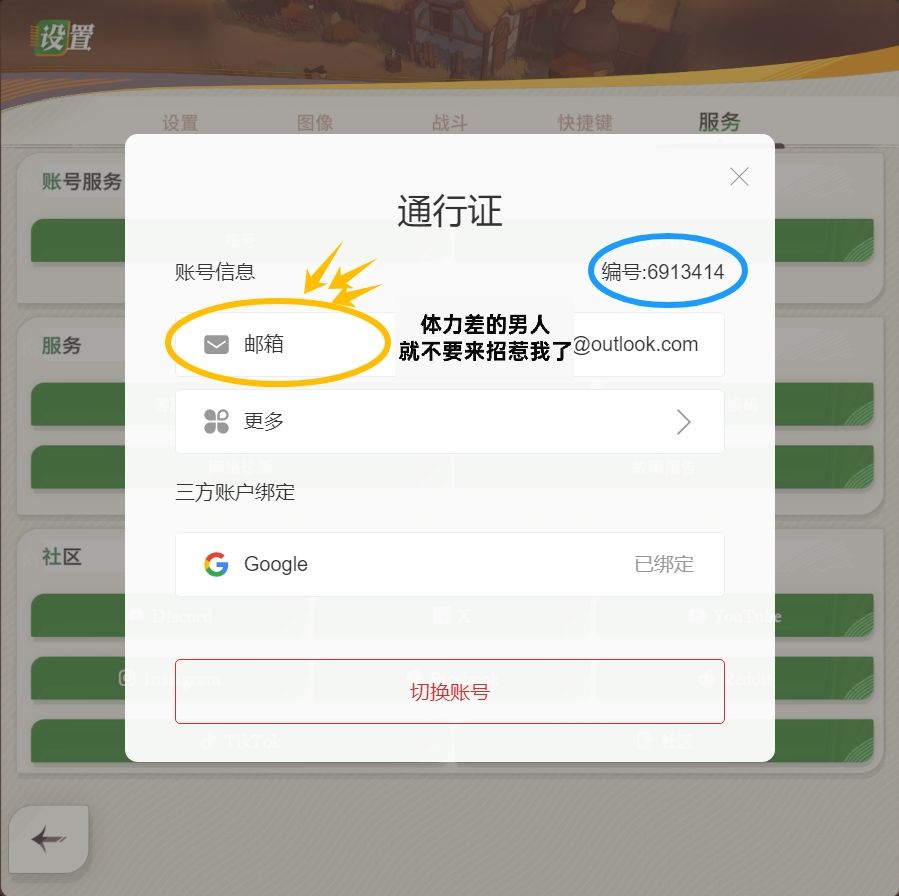 点击【账号】出现如下页面,这里不要点击【切换账号】,直接点击【邮箱】然后输入自己的邮箱绑定即可,我亲测过,QQ邮箱和微软的@OUTLOOK邮箱都可以用。