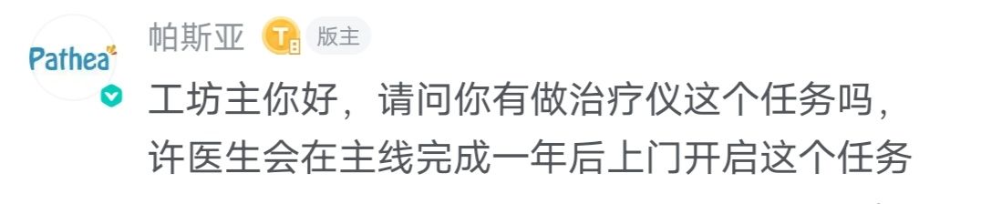 治疗仪的后续任务,第五年开始的,每个月一定要做,五个治疗灯,1-8号一定要提交给许医生,不然!万一希金斯没空做任务,金吉尔下个月就会嘎,有可能希金斯会帮忙做这个任务,也可能不会,所以每个月1-8号,一...