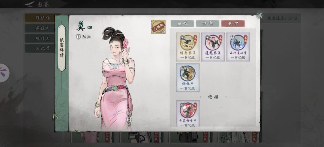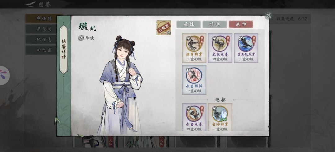 介绍:不错的前排,轻功梯云步能够提供不俗的闪避,为了照顾这个轻功,心法只能选清静经。家传绝招玄冰神掌能配合内劲打输出。