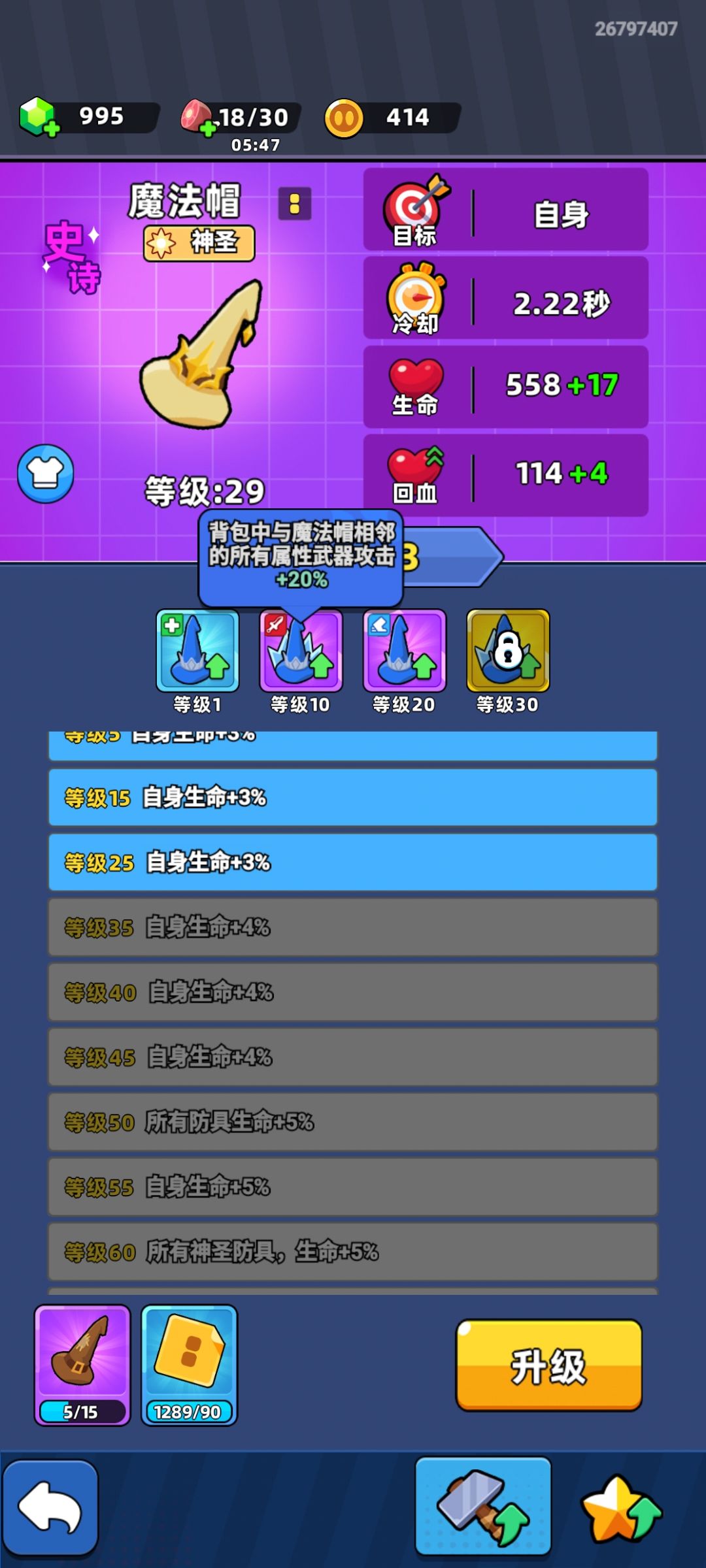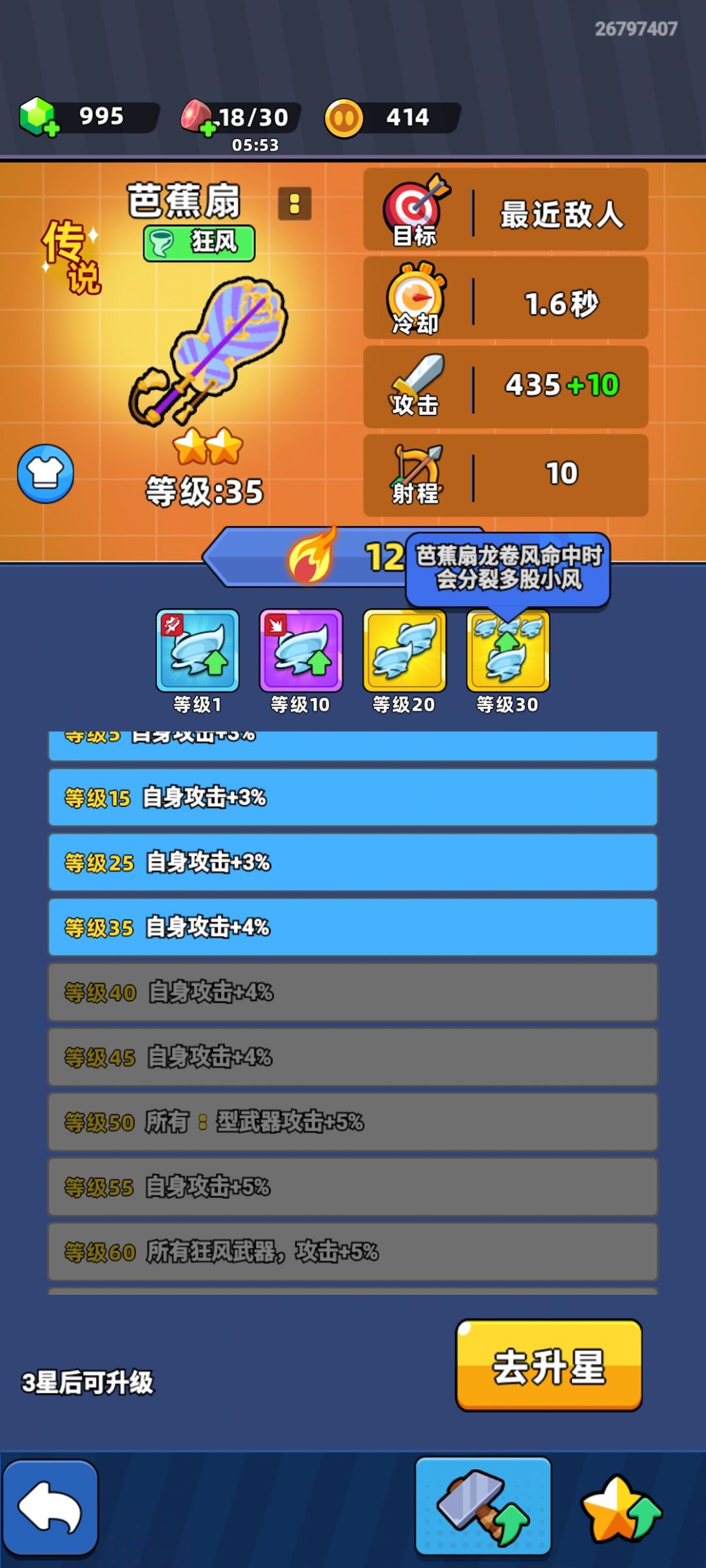 咱们就只上风扇和帽子,哪怕一级二级也不要升级,优先把格子全部占满,千万不要升到满级扇子,亲身测试满级之后大概率就会刷其他武器,刷的多最高升到三级金色扇子就足够了。