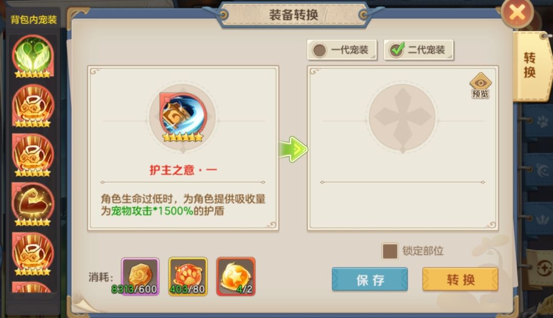 我们合成出来的不需要的六星套装部件,可以消耗一定数量的精灵秘矿、兽灵玉和火红进行转换。转换需要的成本远远高于五个火红合成的成本,因为兽灵玉非常昂贵且是战略储备重要资源。但是好处是转换可以指定一代或者二代套装,直接把获取几率从1/24的几率提升到1/12,这还不算完,我们还可以选择锁定部位转。