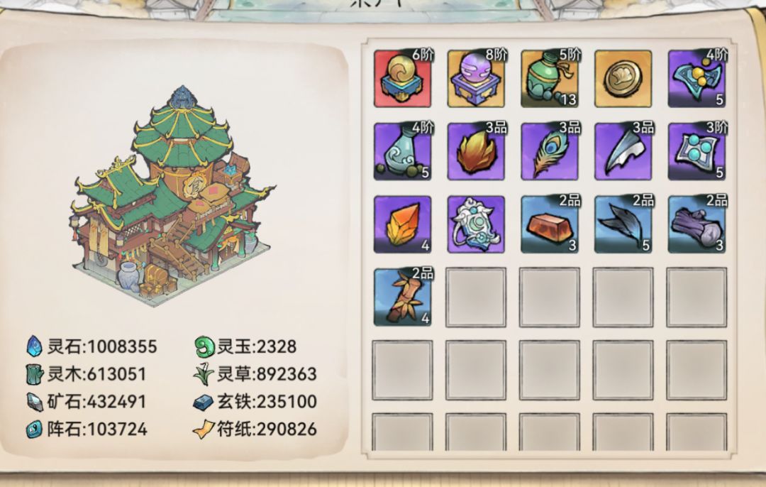 此外随机宗门的橙色古宝也会刷到品质特别好的,特别是加产量加成的(如下图的加玄铁产量的,平常只能靠抽古宝活得)。