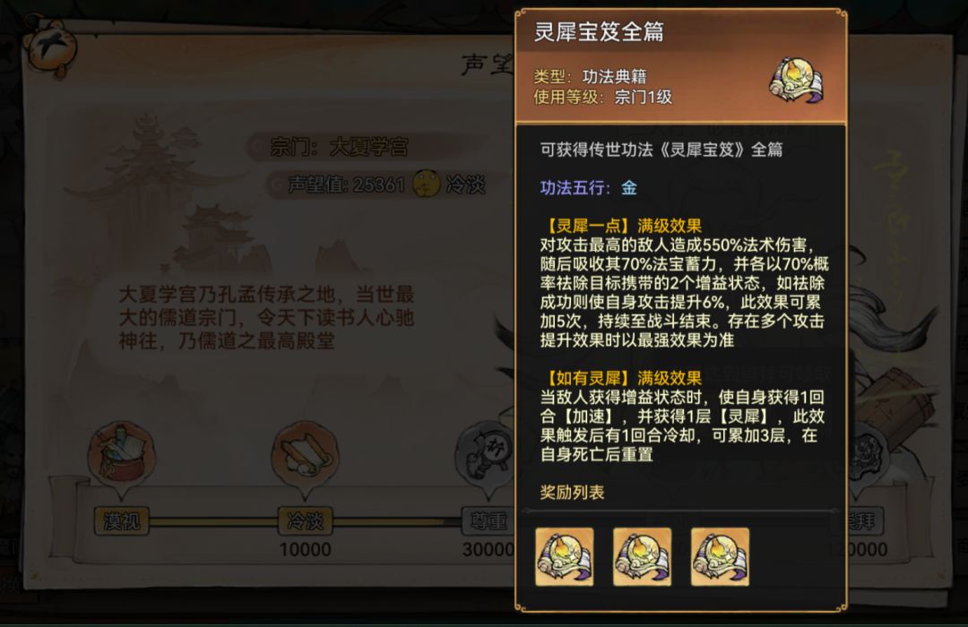 和大夏学宫差不多,有虚灵、大衍、魂归,因为有魂归所以给到3颗星吧。