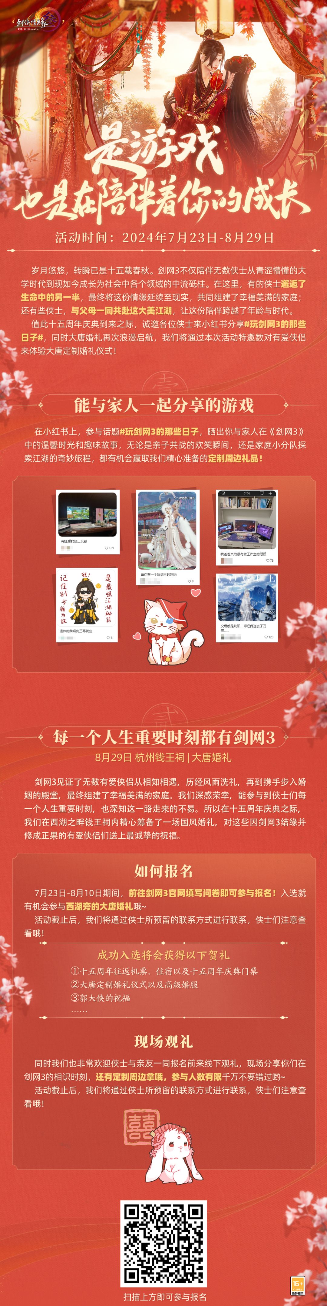 *国风婚礼梦回千年:时隔五年,大唐婚礼再次浪漫启航!我们为因剑网3结缘并修成正果(需持结婚证)的有爱侠侣们送上最诚挚的祝福,欢迎有爱侠侣及想要前往线下观礼(需是剑网 3 玩家)的侠士们扫码报名!