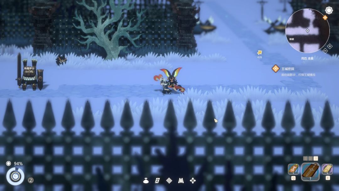 游戏的画面并没有做高规格的渲染,但却将每一个场景都做到了十分精致。即便是开放地图绕不开的大场景,游戏也巧妙地利用景深将远距离的风景虚化掉。既有效避免了大场景破环空间结构,又增加了构图的美感,甚至在有的画面中还将游戏的氛围感在有限的规格中被完美激发了出来。在一处“邪魔化”精英怪的栖息处,路旁的地灯整齐地排在两边,由近至远,由亮至暗,深处的“邪魔”精英怪在虚化的背景中显得神秘而又阴森。