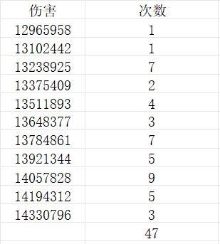 但也没事,在过程中,我发现了有些伤害值总是出现,于是我就把伤害值和相应出现的次数记录,顺便升了个序,列成了一个表,列表如下: