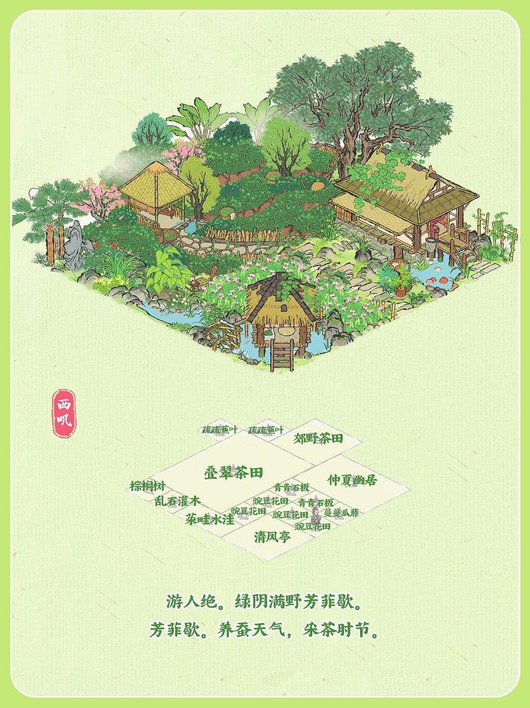 建筑:叠翠茶田,郊野香樟,仲夏幽居,清风亭,菜畦水洼,乱石灌木,青青石板,蔓蔓瓜藤,疏疏蕉叶