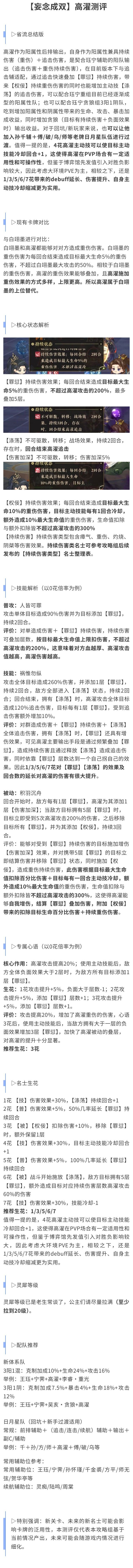 高濯作为阳属性后排输出,自身作为阳属性兼具持续伤害(重伤)+追击伤害,是契合珏宁辅助的阳队输出(追击伤害+重伤持续伤害),在目前版本下与追击辅适配,通过追击快速叠加【罪愆】持续伤害,带来【权佞】持续重伤伤害的同时也能增加主动技【涤荡】的追击伤害,可以配合珏宁重组目前已经逐渐成型的阳属性队,也可以配合珏宁贪狼组3阳1阴队,吃到增加阳属性和阴属性带来的生命、攻击、暴击加成收益,同时增加贪狼(目标有持续伤害+负面效果时)输出收益。