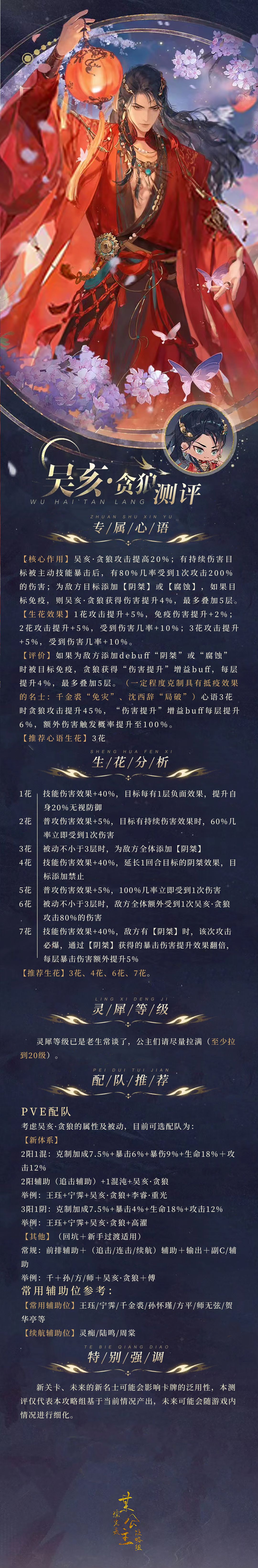 吴亥·贪狼是一位依靠持续伤害效果【阴桀】和【腐蚀】进行持续输出的阴属性名士。他是一位集暴击提升、暴击伤害提升、施加持续伤害于一身的输出名士(1-2花对单,3-7花可对群),同时还拥有阴属性独有的暴击相关属性全队增益提升,可主C,可副C,性价比极高。队伍属性上,阴属性名士能提升全队暴击相关属性(暴击/暴击+暴伤,因上阵名士不同而不同,参见配队举例),可以与阴阳混沌组队带来全队暴击相关增益;同时功能性上可以作为持续伤害队的C位未来可期。