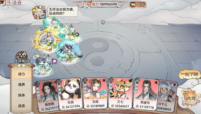 第二套阵容:卫寒、萧辰、银无月、唐蝶衣(大荒+凤魂 本命镇岳 技能二阶木头)、龙人 VS对面 :双速画、韩立、龙人、萧辰、南宫婉这里我上唐蝶衣也是因为要解决对面双速画的问题、打反手。用天命技能,释放法宝,解除禁增。