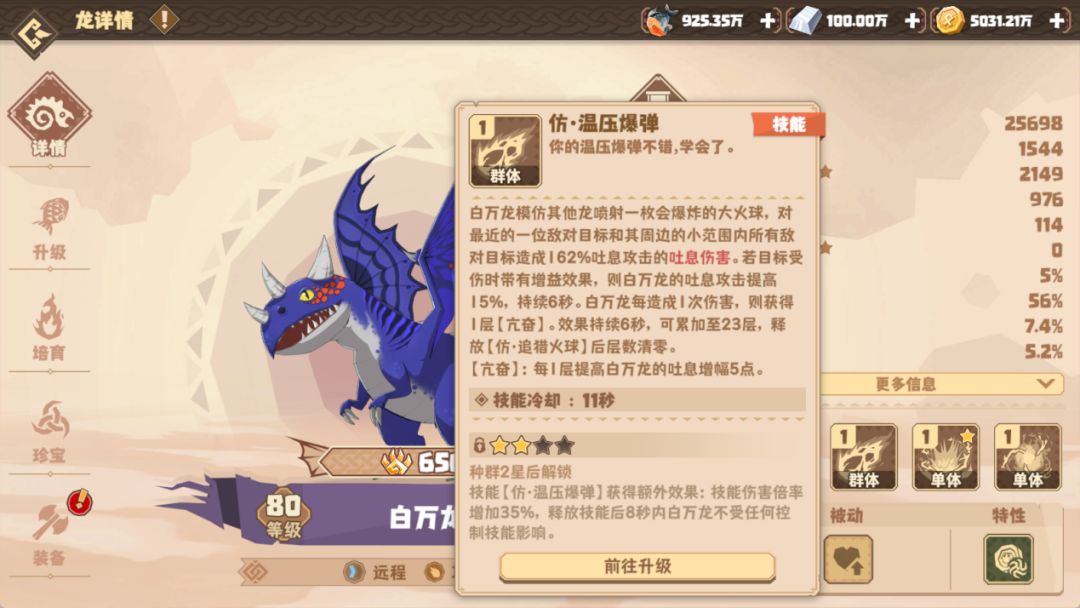 技能描述:白万龙模仿其他龙喷射一枚高温火球,对当前生命值百分比最低的一位敌对目标造成490%吐息攻击的吐息伤害。如果本次攻击成功使目标逃亡则白万龙额外获得200怒气。