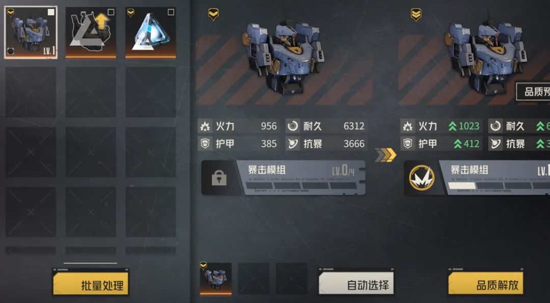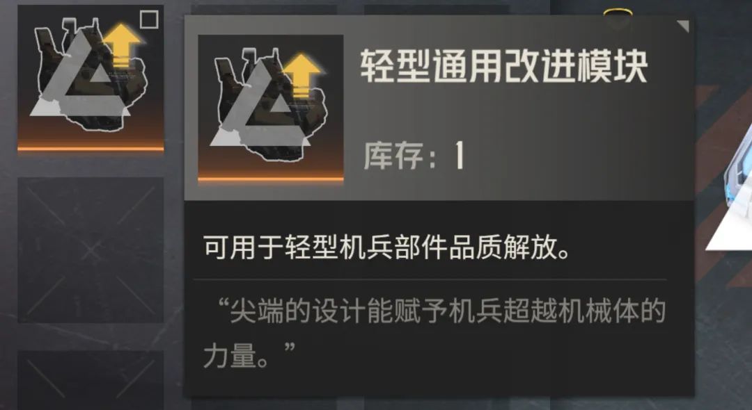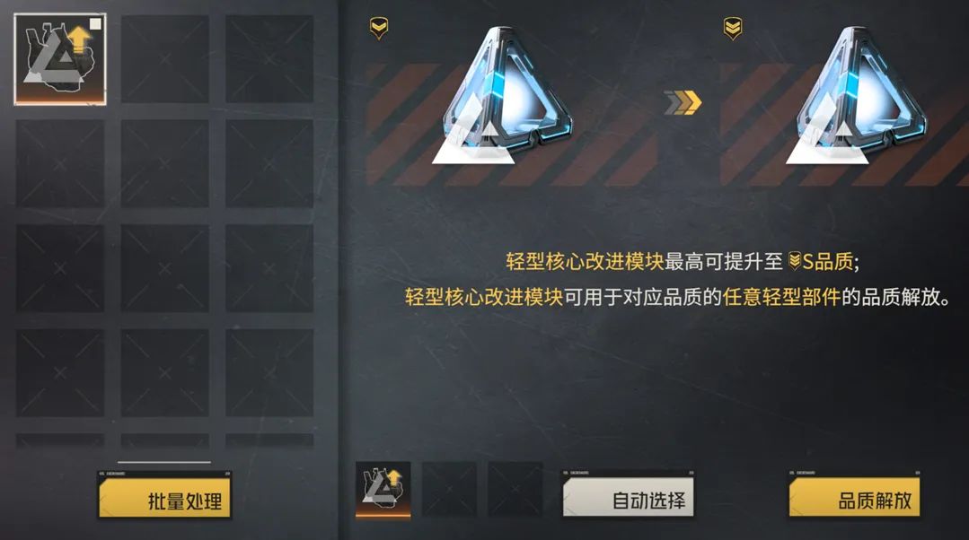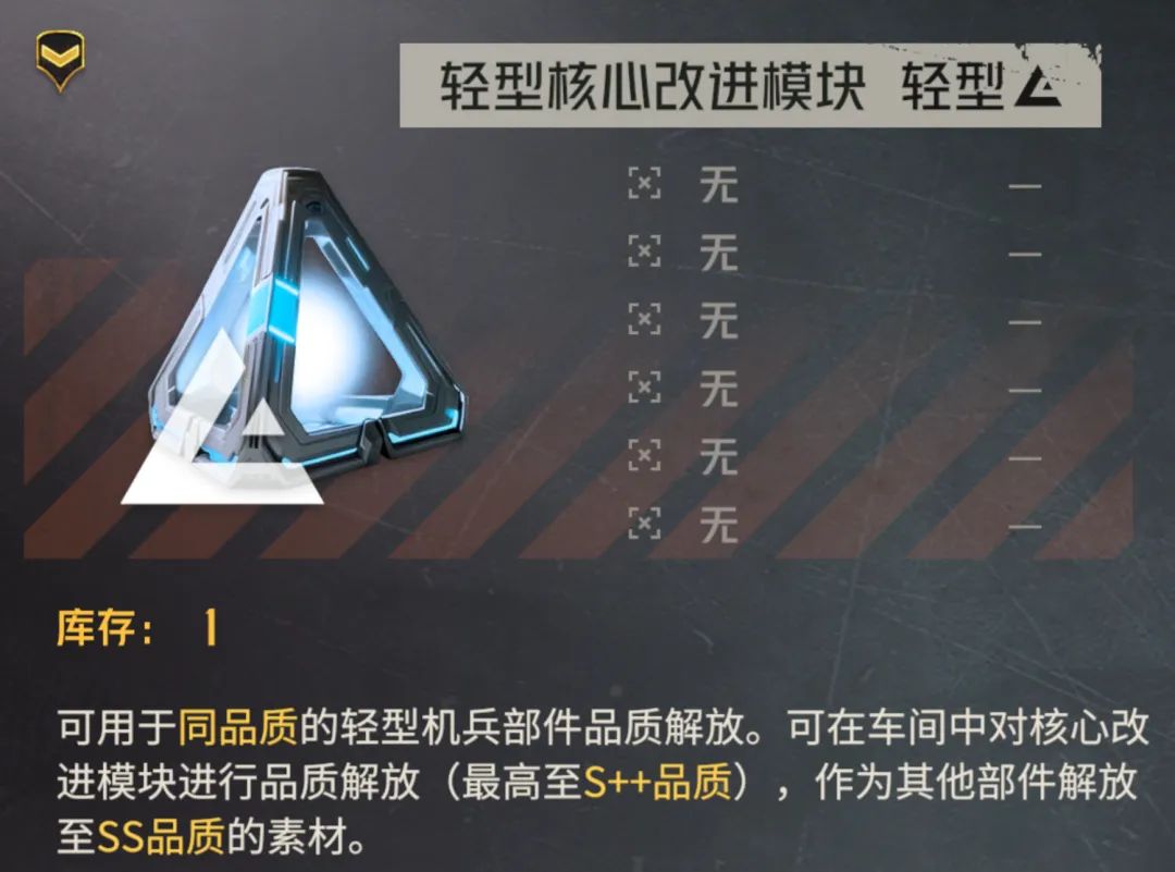 那么如果大家现在手上有一个金1品阶的机兵部位,则可以通过同样的机兵部位、通用改进模块或核心改进模块来升级到金色2星品阶,但这里不到万不得已请不要选择新出的这个“核心改进模块”,因为: