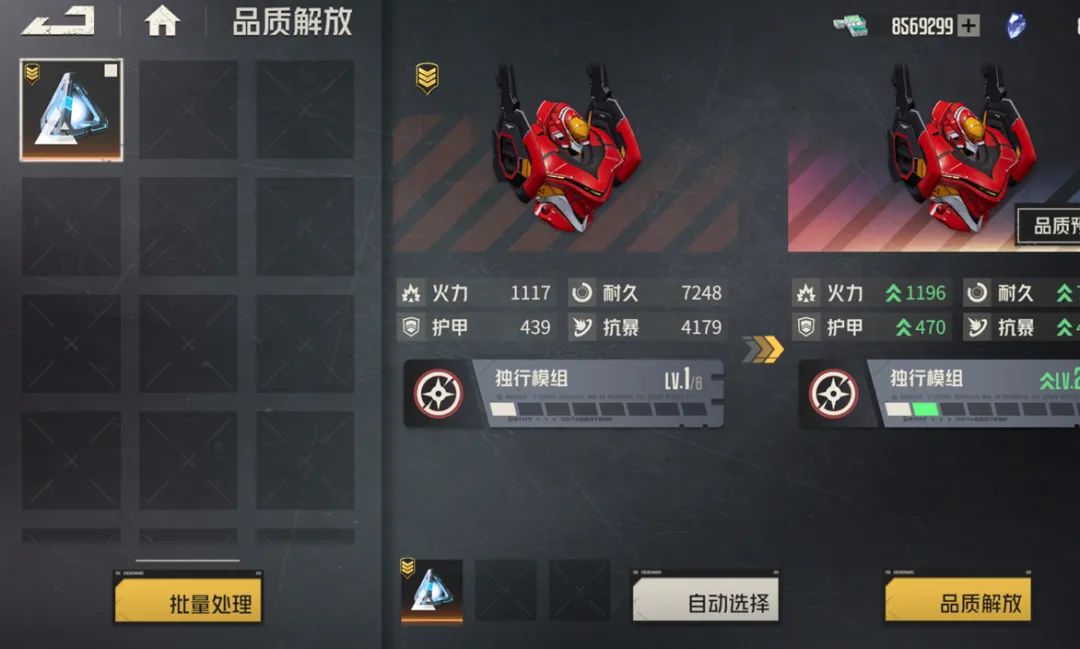 这个核心改进模块是可以通过同类型的通用改进模块提升到金色2星品阶的,然后我们便可以同一些金色2星机兵部件升级到金色3星部件的过程,选择两个同类型机兵的紫色金色2星狗粮给提升到金色3星即可。