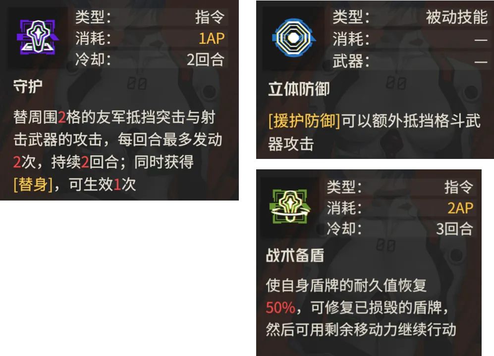 接着是3个与防护有关的技能,【守护】这个技能最大的特点是可以超远距离进行援护,此效果挺有意思的,部分特殊的场合搞不好能有奇效。然后【立体防御】也挺有意思,首个能防护格斗攻击的技能,所以未来的PVP中明日香和迪恩算是被针对了么?最后【战术备盾】是无法修复在刚刚大招攻击敌人后损坏的盾牌的......其余时间则可以立刻修复。