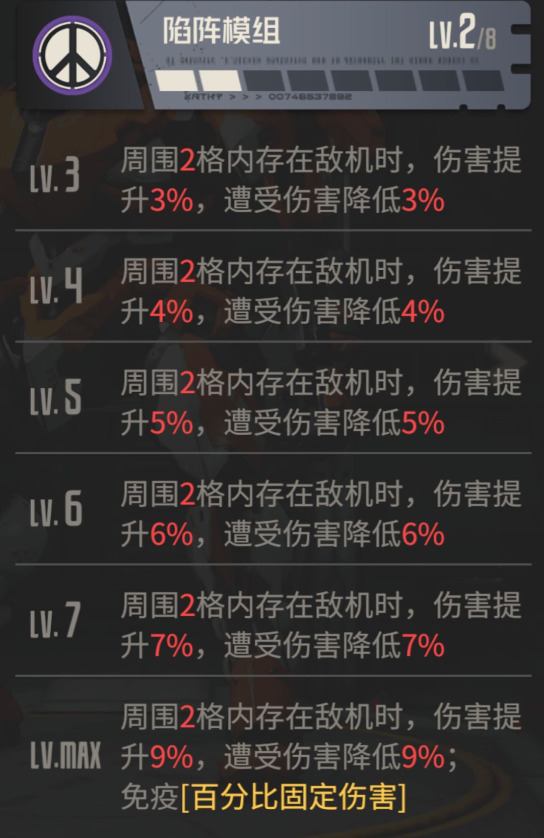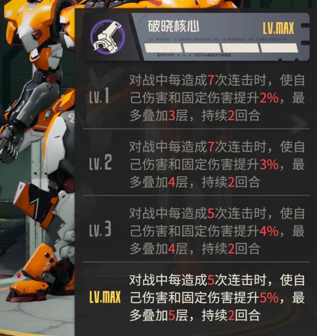 然后是绫波零的专属机兵cos版零号机,这个机兵的模组效果那就非常简单了,就是一个提升伤害与抗伤的辅助,此外升到最高级还有一个免疫百分比伤害的效果,这点在未来的PVP方面肯定会有较大的意义。