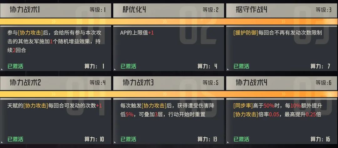 最后则是3个被动/指令技能,第一个是协力击破部位后可以给“率领”此次协力的角色回复1点AP,这个率领的意思其实就是主动攻击的那个;然后第二个是互换位置,这个技能可以一定程度上弥补绫波零小短腿的问题,同时也能在关键时候起到特殊的战术作用;第三则又是一个回复AP的效果。