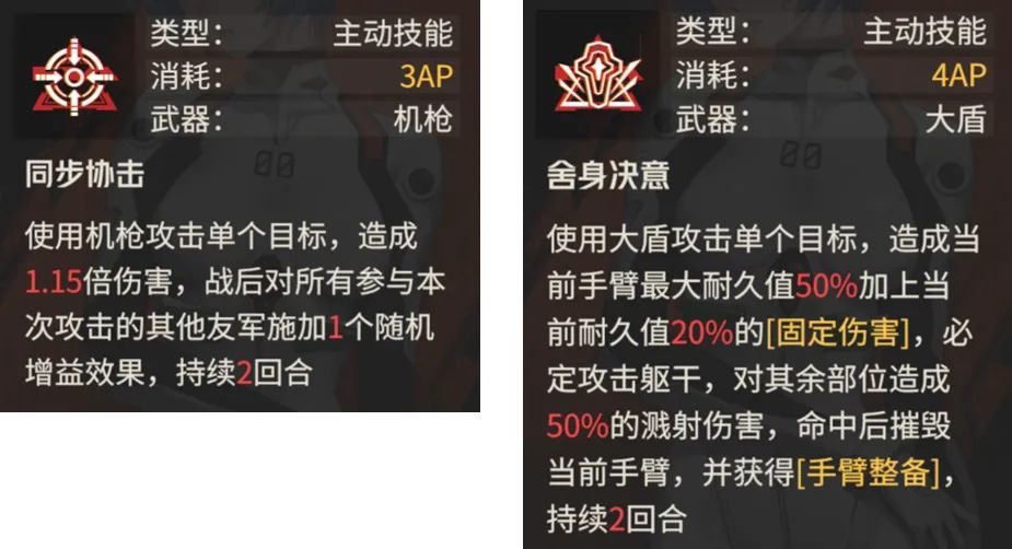然后是技能方面,首先攻击技能有2个,一个是用机枪攻击,可以带来协力友方的施加buff效果,另一个则是用大盾攻击,必中躯干和具有一定溅射效果的固伤输出。那么这两个技能,其实第一个就是以给buff为主,伤害我看了看......大家不用抱太高期待,接着第二个则是伤害还行,但有一个问题就是3回合内只能用1次......所以这个技能的持续性不太好,同时针对精英敌人或boss级别的敌人,也不见得能发挥多么夸张的效果,同时因为盾没了,还会对接下来的防护带来很大的负面影响,部分时间会给我一种得不偿失的反馈。
