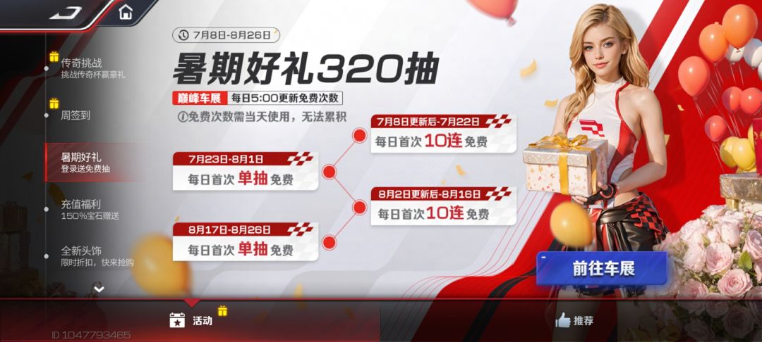 想必各位车手也是早已拿下了这台典藏传奇吧,听小极的,千万别收手!因为盛夏车手季福利狂欢还在继续,陪你嗨翻一暑假!7月23日起,车手们每日上线还能在车展中领取到免费一抽;领奖展台福利满满,海量钻石和宝石车钥等你兑换;更有排位福利加码,向更高段位冲击最高可拿走231抽!