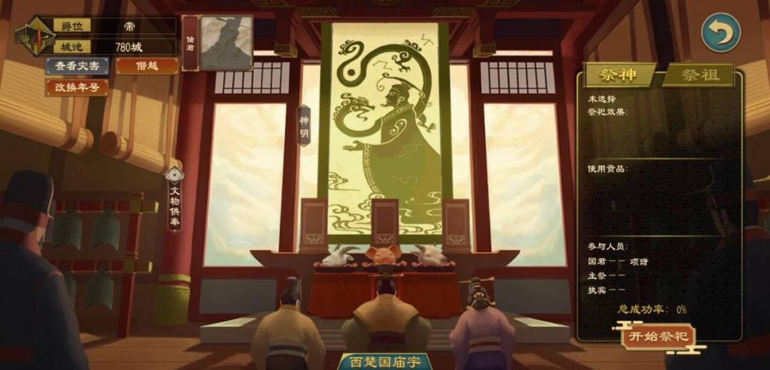 祭祀:(祭神/祭祖)祭神基本只需要祭祀,谷神,皇天,后土,司中这四位,祭祖随机获得正统/国君生子率/减少猜忌,看国家状态选择祭祀种类,如果失败就回档。