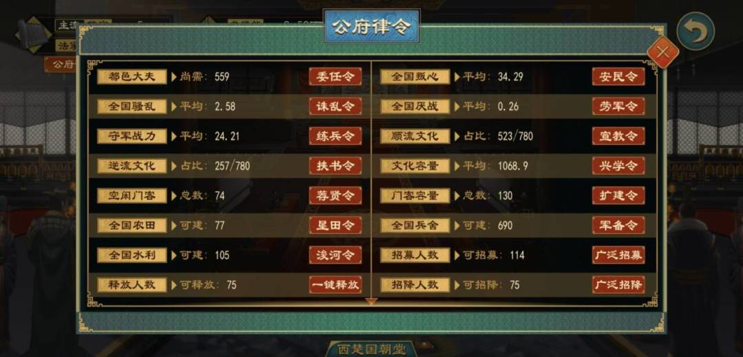 荐贤令:可以荐贤选拔人才最高5~20个,消耗粮食执行且需要三个月份,人才的属性及其人数受到所执行大臣的属性和流派影响,推荐使用高智略的儒家大臣。