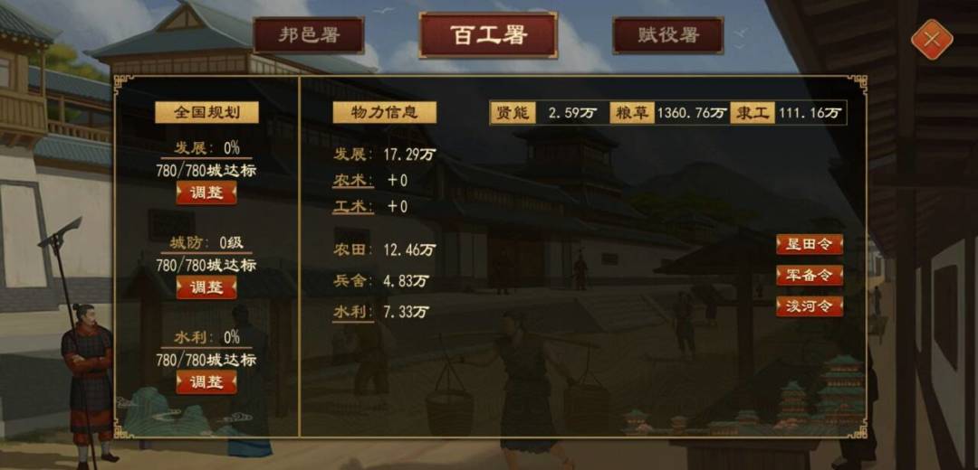 司农署:查看全国各地粮仓的地方,注意腐败粮食,记得每年的建设粮仓容量,提高粮食使用率。