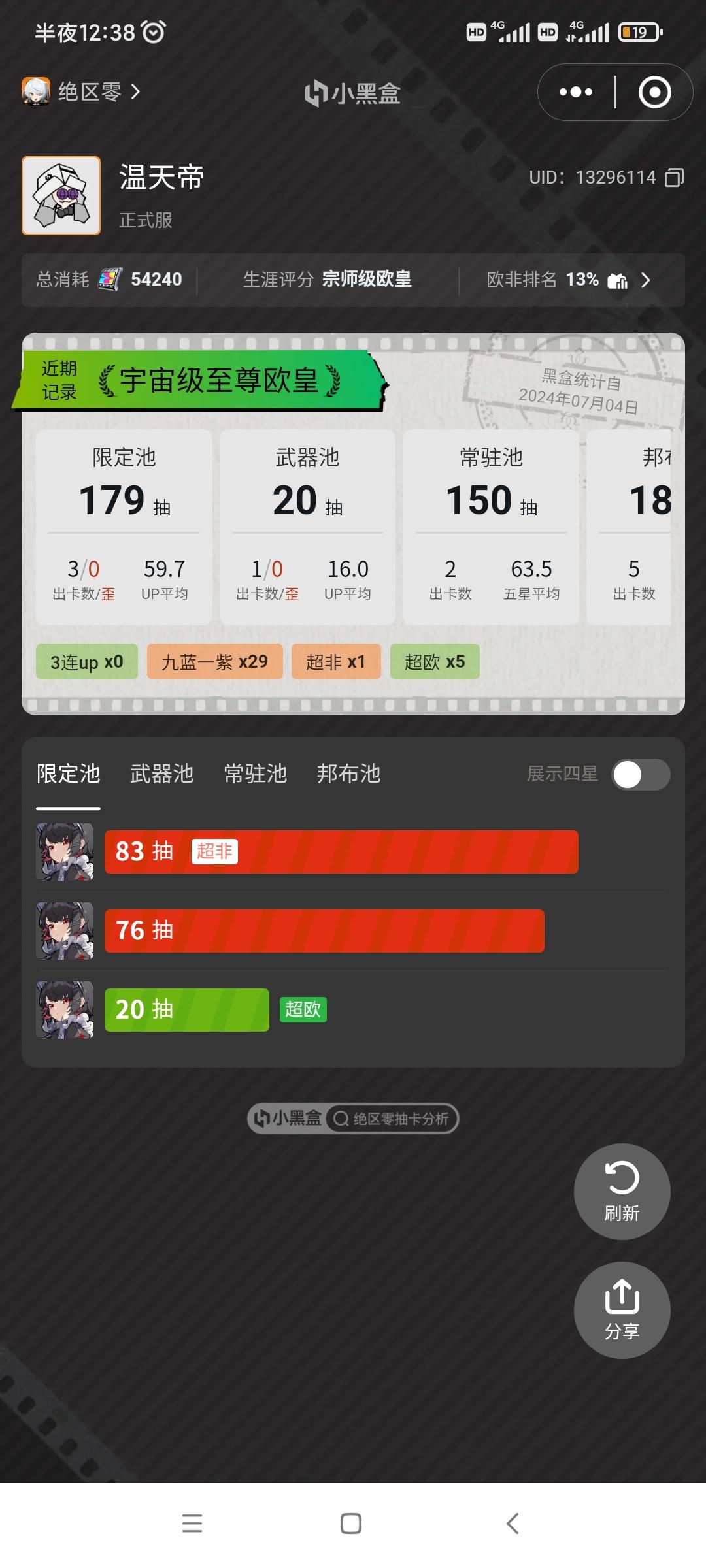 等级43级,各种资源基本拿完,氪度30+68+6 资源统计限定240抽,常驻150抽,邦布180抽